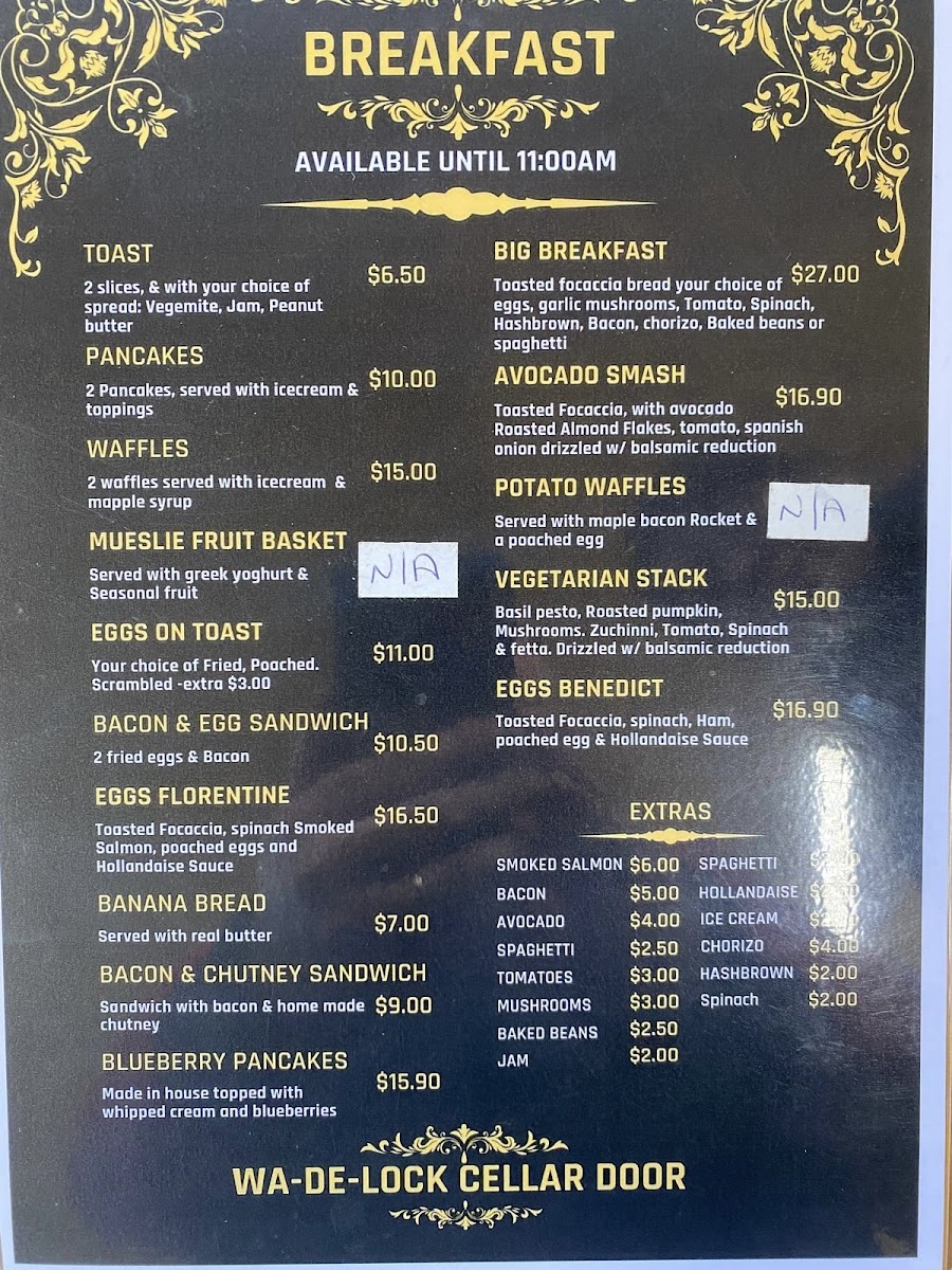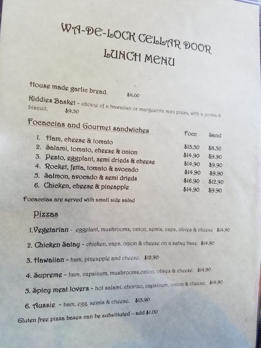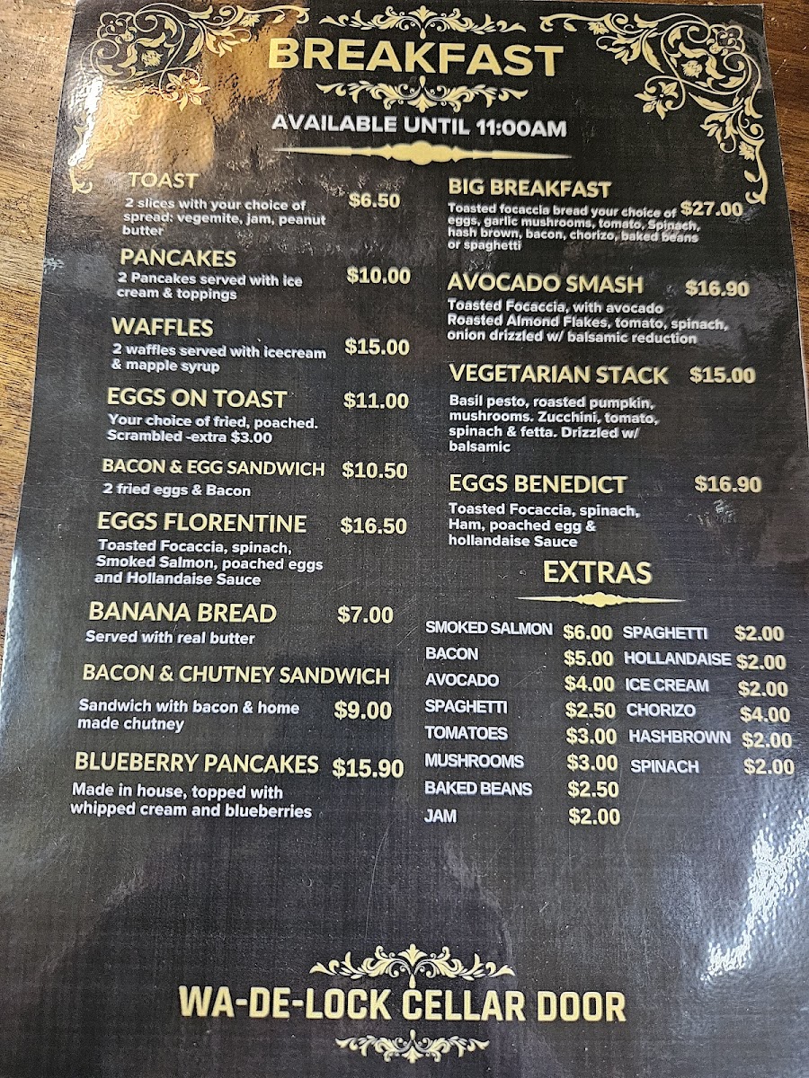 In conclusion, Wa-De-Lock Cellar Door offers a well-rounded menu that combines comfort and quality, with options for every palate. Whether you're starting your day with a hearty breakfast or enjoying a delicious sandwich or pizza for lunch, there's something for everyone. Add a refreshing drink from their wine and beer selection, and you have the perfect meal experience.