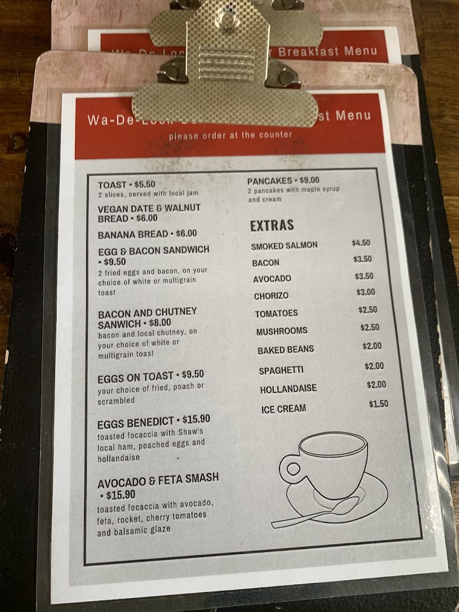 The menu at Wa-De-Lock Cellar Door offers a delightful variety of dishes, catering to both breakfast lovers and those seeking a light meal or drink in a cozy setting. Starting with breakfast options, you can enjoy Toast, Pancakes, and Waffles, as well as heartier choices like Eggs on Toast and the classic Bacon & Egg Sandwich. For an extra touch, diners can add Smoked Salmon, Spaghetti, or Bacon Avocado, with a drizzle of Hollandaise to elevate the flavor profile.