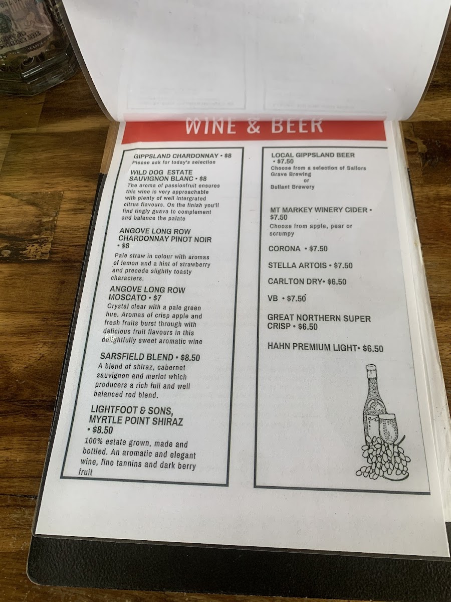 To complement your meal, the wine and beer list at the restaurant features local favorites. The Gippsland Chardonnay and Wild Dog Estate Sauvignon Blanc are excellent choices for white wine enthusiasts, while the Angove Long Row Chardonnay Pinot Noir and Angove Long Row Moscato offer a variety of options for wine lovers. For those preferring something a bit stronger, the Sarsfield Blend provides a robust flavor profile.